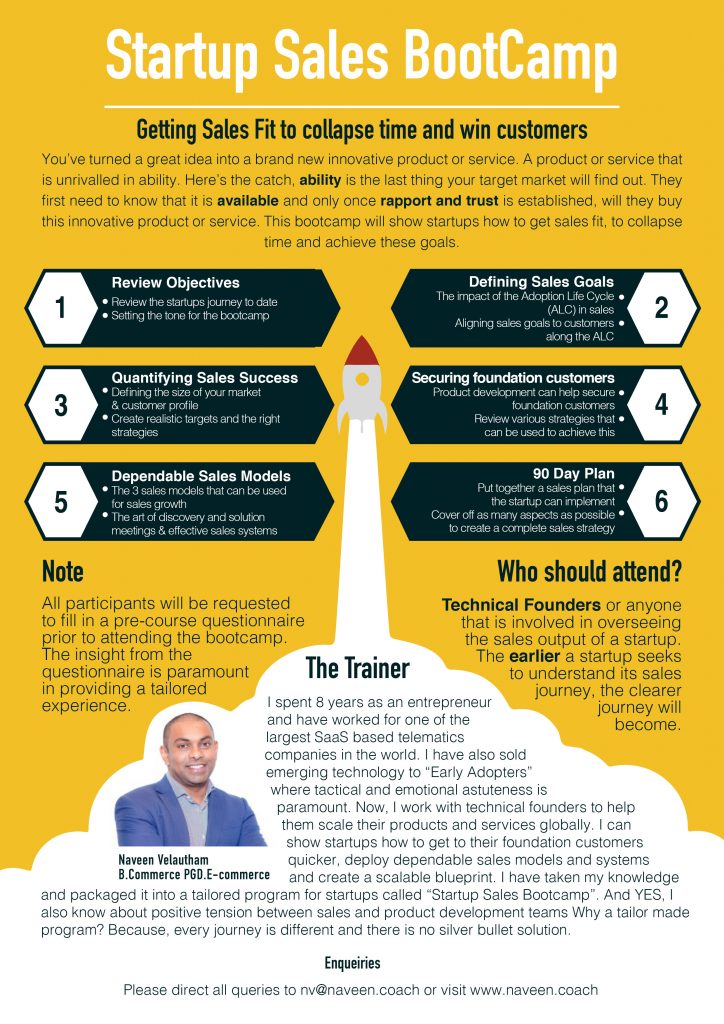 Startups can’t afford to employ sales founders early in their journey, so that’s why I offer a “step in step out” service and am available on demand, to help start ups get sales fit